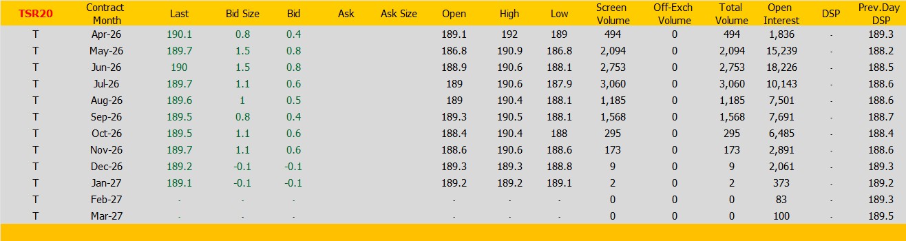 ราคายางTSR20 ตลาดยางSICOM ราคาส่งมอบเดือน เม.ย.ปิดที่190.1 เซนต์สหรัฐ ราคาเพิ่มขึ้น 0.8 เซนต์สหรัฐหรือ คิดเป็นเปอร์เซนต์ +0.42% %